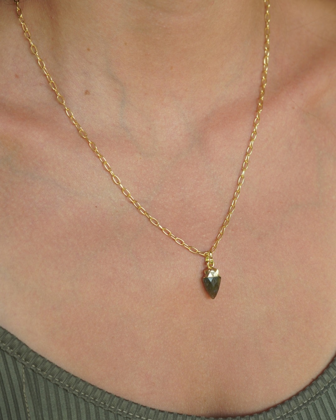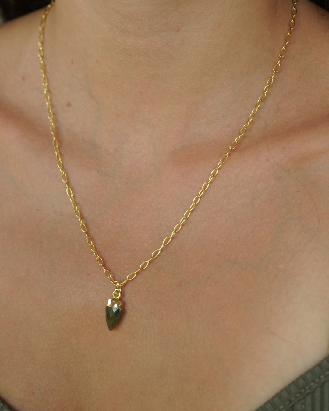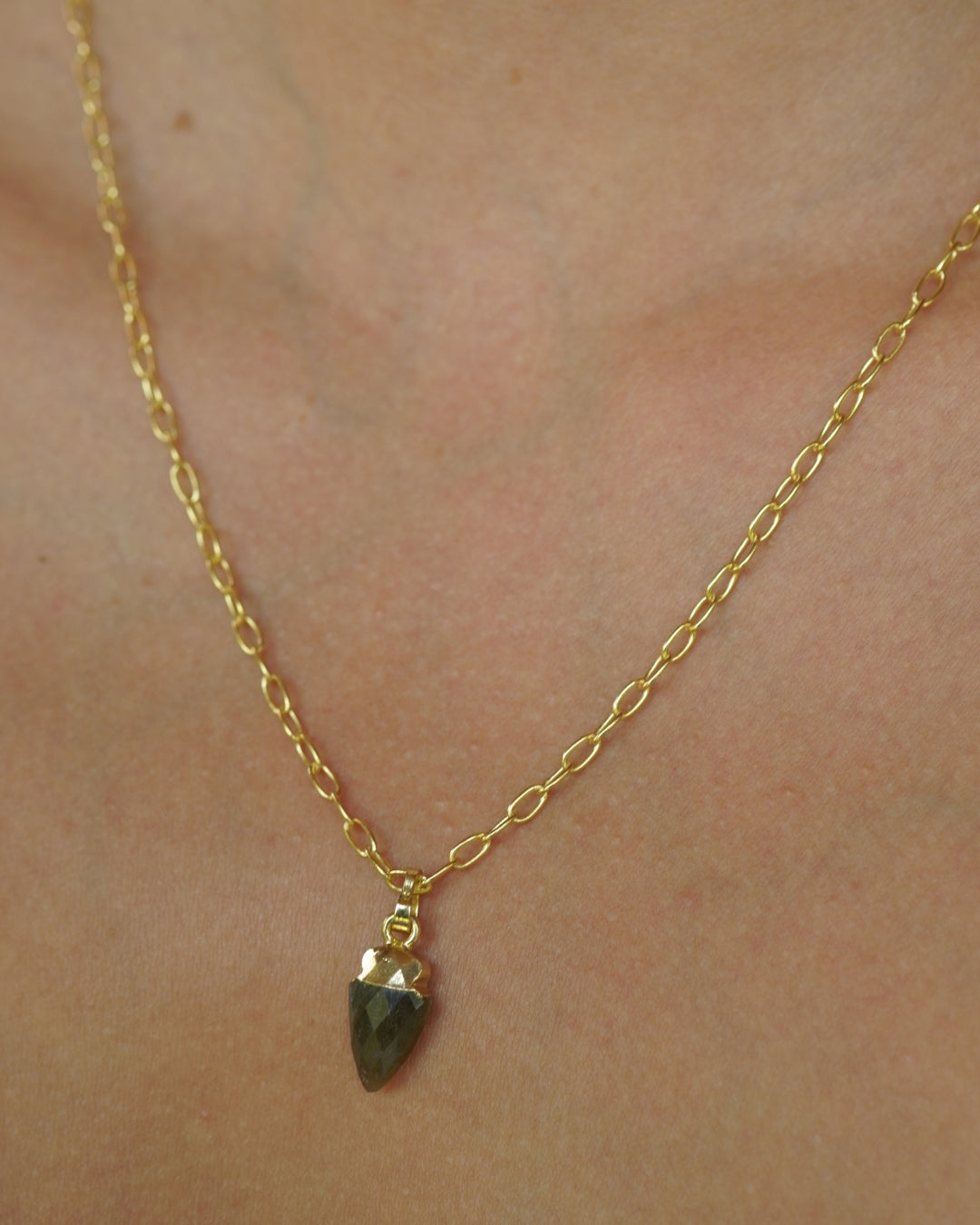 Collar Gold con cadena de eslabones y dije de piedra en forma punta con destellos azules y verdes, la piedra esta unida en un casquillo enchapado en oro 18k.